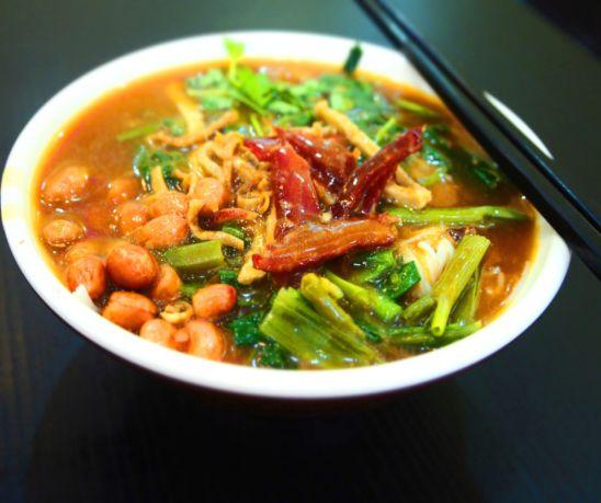 陵水酸粉,因为海南陵水制作的酸粉最好吃最有名,所以以陵水地名来命名此粉,这粉的味道是酸的,其实不仅有酸,还带有一点甜香,用料非常丰富,炸的酥脆的花生米、切成薄片的牛肉干、风干的鱿鱼丝、“海南粉类配料之王”鱼饼条、空心菜、韭菜、香菜等,粉是用的最细的米粉丝,虽然细,但是很有韧性,吃起来口感很好。