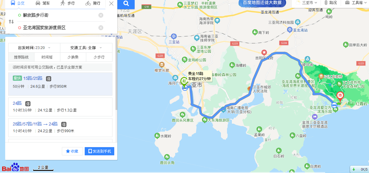 从三亚解放路步行街到亚龙湾具体可以有三种方案:方案一,可以坐公交车大约一个小时到达,约24.5公里。方案二,可以驾车约40分钟,大约23公里。方案三,骑行约俩个小时,约22.3公里。