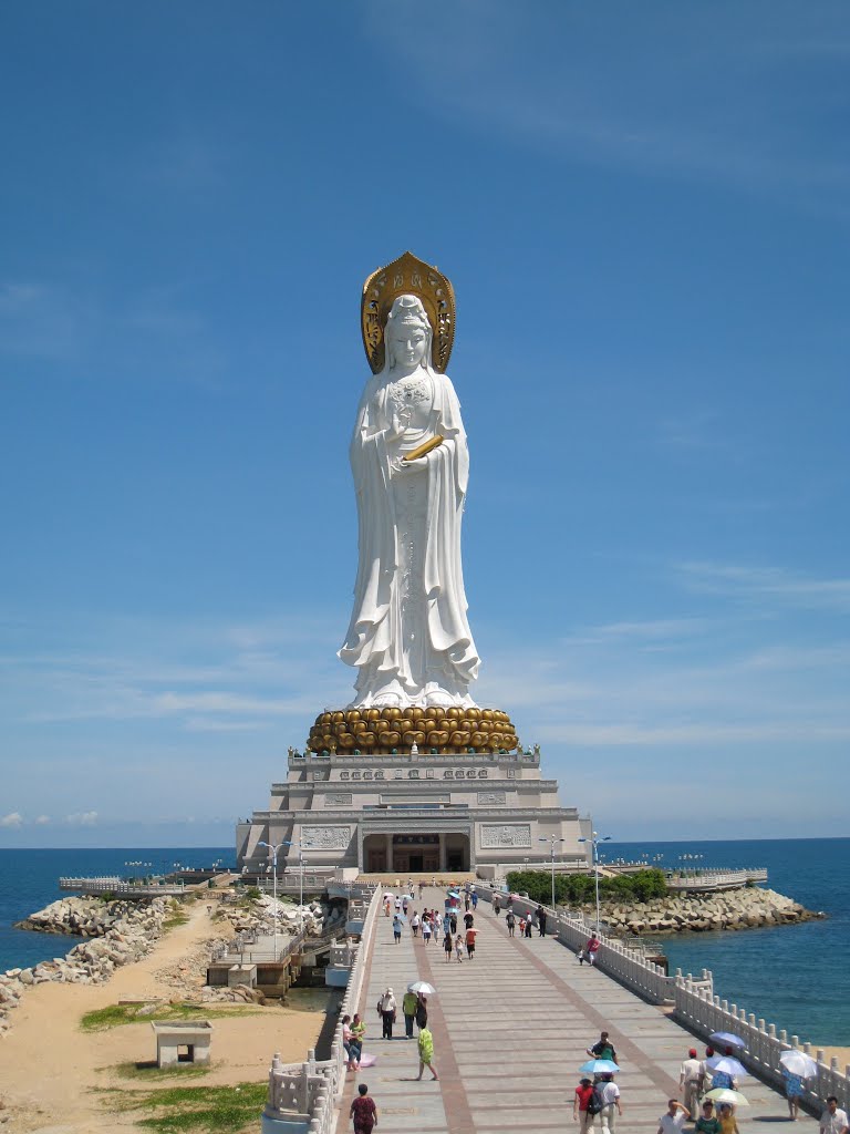 一百零八米的海上观音比自由女神还要高15米,乃世界最大的白衣观音造像并且是世界上最高的观音像,为钛合金材料敬造。在南山海上观音建成之前,高八十八米、被誉为“神州第一大佛”的无锡灵山大佛是最高的,而南山海上观音像建成之后,灵山大佛的高度纪录就被刷新。观音圣像一面是手持莲花,另一面是手持经书,还有一面是手持佛珠。为正观音的一体化三尊造型,宝相庄严,脚踏一百零八瓣莲花宝座,莲花宝座高十米,共四层,每层有形状相同的二十七瓣莲花,及其壮观。