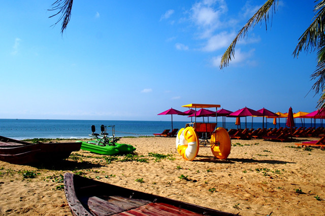 蜈支洲岛游泳池:电影私人订制的拍摄地,大大的白色帐篷,浪漫的白色摇椅,让这片蓝色的天地一夜成名。游泳池置于蓝天,椰子林之间,显得格外的清幽和美丽。