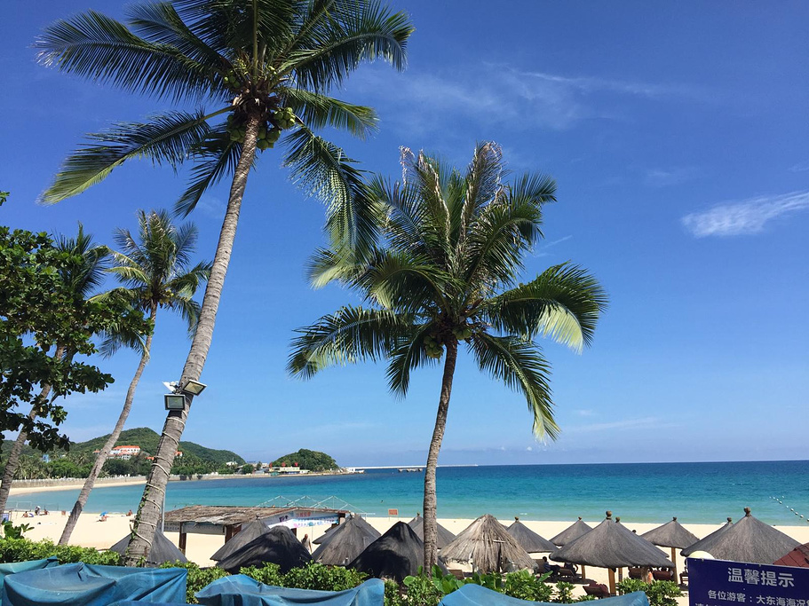 大东海三面环山,整个海湾呈优美的月牙形,一排排翠绿椰林环抱着沙滩,辽阔的海面晶莹如镜,环境十分宜人。鹿回头风景区便坐落在这片海湾不远的地方。