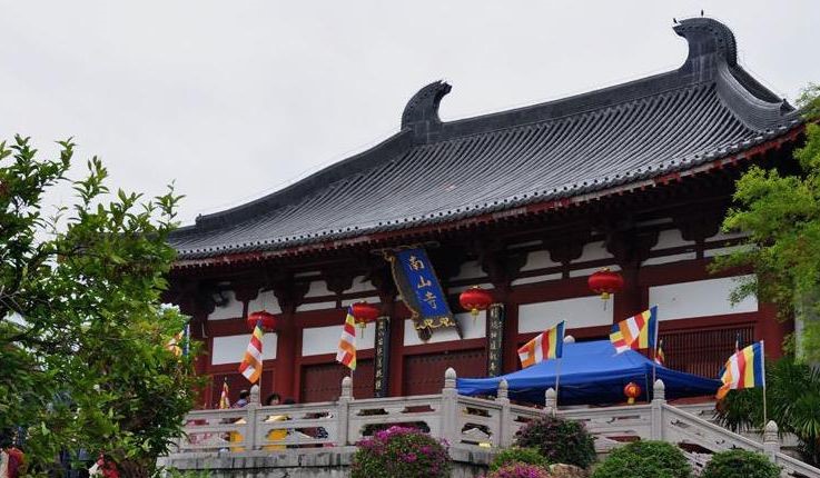 南山寺是一座仿盛唐风格、居山面海的大型寺院。南山寺是已故中国佛教协会会长赵朴初亲临选址,经国家宗教局批准,于1995年11月11日奠基,1998年4月12日建成。现有仿唐建筑仁王殿、天王殿、钟楼、转轮藏、东西爬山廊、东西配殿、金堂等建筑群,总建筑面积5500㎡。整个建筑气势恢宏,为中国近五十年来新建的最大佛教道场,也是中国南部最大的寺院。自古名寺出高僧,南山寺的方丈是86岁高龄的高僧新成大和尚,监院是中国佛教协会副会长明生法师。南山寺第二期工程已启动。按照规划设计,第二期工程遵循古代大型佛教寺院方正划一、主次分明的特点,将主要建筑集在中轴线上,在两侧设置12个不同功能的四合院。二期工程完成后,整个南山寺东西宽188米,南北长416米,共8个台阶总高差49米,总建筑面积4万平方米。