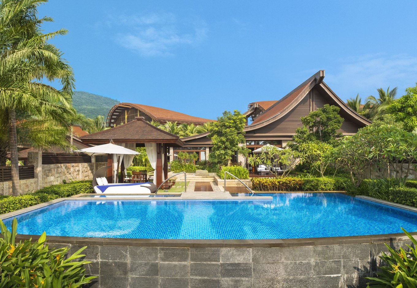 【泳池】:酒店别墅房型每栋带一个私家泳池,园林有公共泳池,造型经典