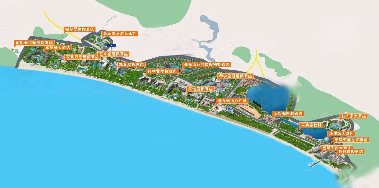 因酒店较多,如下列举了80%游客会选择入住的酒店来进行分析,先来看一张亚龙湾酒店分布图。