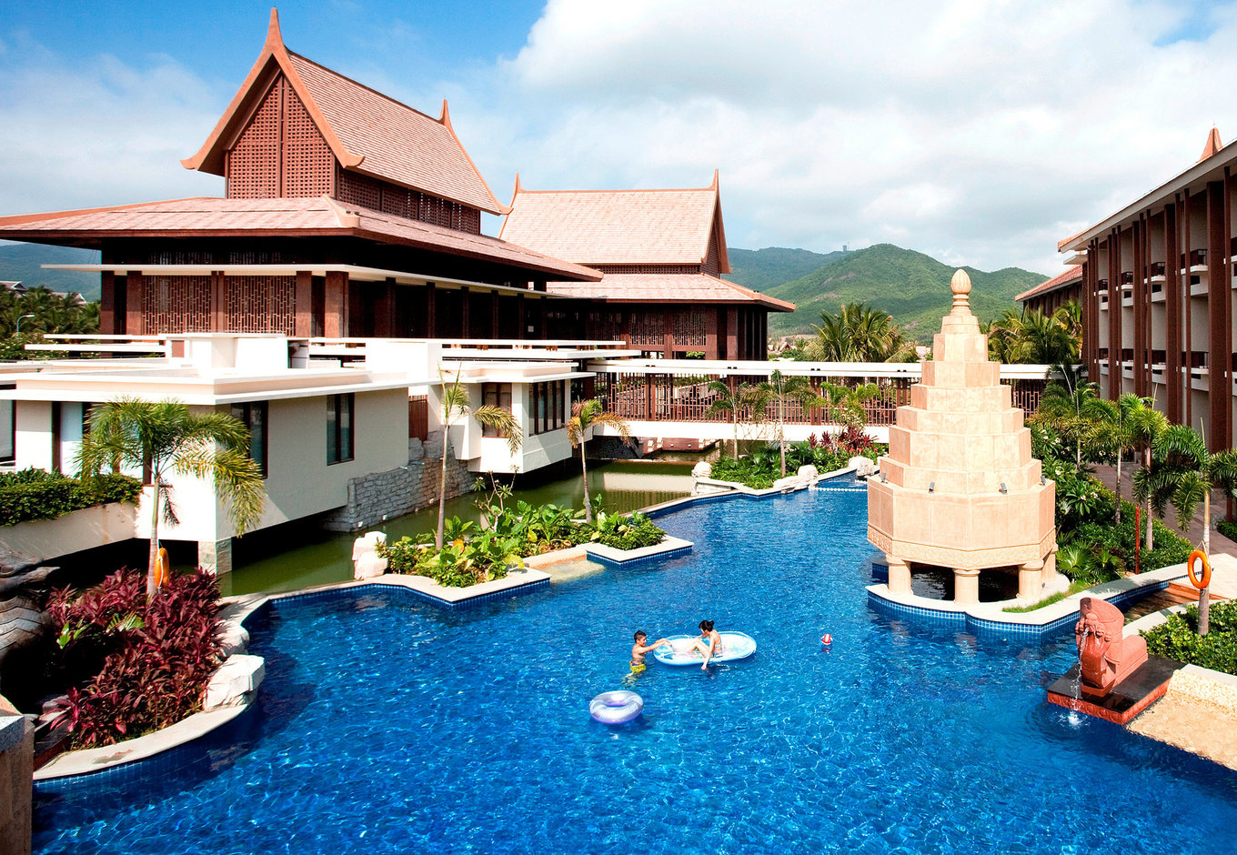 亚龙湾泳池数量最多,品类最丰富的酒店。拥有8个户外泳池,5个五行元素主题的餐厅和酒吧和1个镶嵌在园林中心的泳池吧。涵盖环形、无边、恒温、儿童多种。池水深度从0.9m-1.5m不同,合理而全面地覆盖不同住客的需求。特别是两个心思独到的沙滩泳池,让宅们不出酒店也能获得海滩的享受体验。