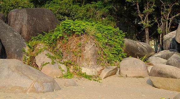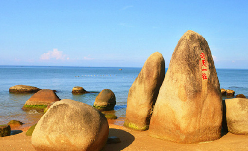 天涯海角海中有块心心相印的石头,代表着海枯石烂心不变,不过要坐快艇才能照到照片。这两块石头自然天成,交错成心的形状,这里是中国最南边的地方。