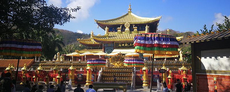 南山寺位于三亚南山文化旅游区内,是一座仿盛唐风格、居山面海的大型寺院。现有仿唐建筑仁王殿、天王殿、钟楼、转轮藏、东西爬山廊、东西配殿、金堂等建筑群。正殿叫金堂,金堂里供奉着的这三尊主像,便是代表着空间上的“横三世佛”。整个建筑气势恢宏,为中国近五十年来新建的最大佛教道场,也是中国南部最大的寺院。