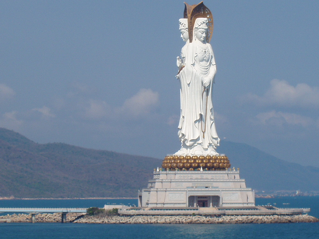 南山海上观音圣像高108米,凌波伫立在海上金刚洲上,被誉为是“世界级、世纪级”的佛事工程。一体化三尊造型,宝相庄严,脚踏一百零八瓣莲花宝座,莲花座下为金刚台,金刚台内是圆通宝殿。金刚洲由普济桥与陆岸相连,普济桥另一侧是观音广场及广场两侧主题公园。此外还充分运用高科技手法打造灯光夜景,充分展示“佛光普照”、“踏海而来”等观音文化艺术效果。