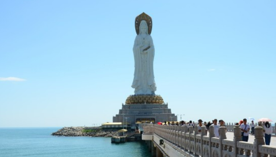 南山海上观音圣像高108米,凌波伫立在直径120米的海上金刚洲(观音岛)上。像体为正观音的一体化三尊造型,宝相庄严,脚踏一百零八瓣莲花宝座,莲花座下为金刚台,金刚台内是面积达15000平方米的圆通宝殿。此像由海南三亚南山功德基金会发心敬建,一体化三尊,巍峨壮观,实乃世界造像之最。
