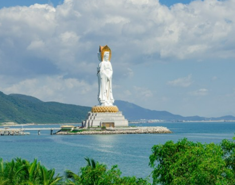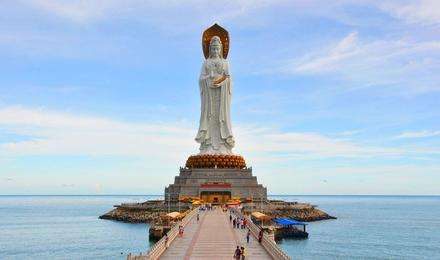 南山海上观音圣像高108米,凌波伫立在海上金刚洲上,被誉为是“世界级、世纪级”的佛事工程。一体化三尊造型,宝相庄严,脚踏一百零八瓣莲花宝座,莲花座下为金刚台,金刚台内是圆通宝殿。