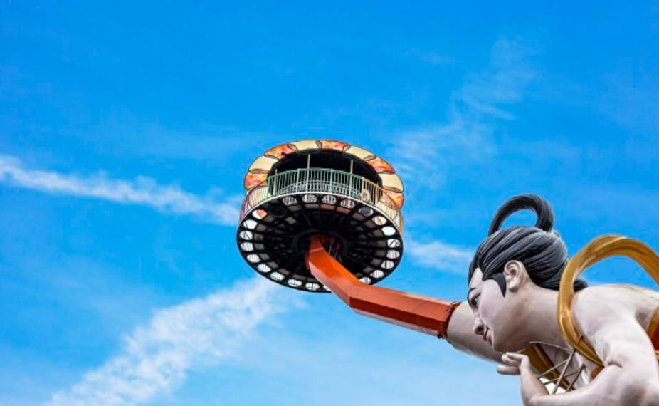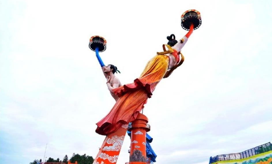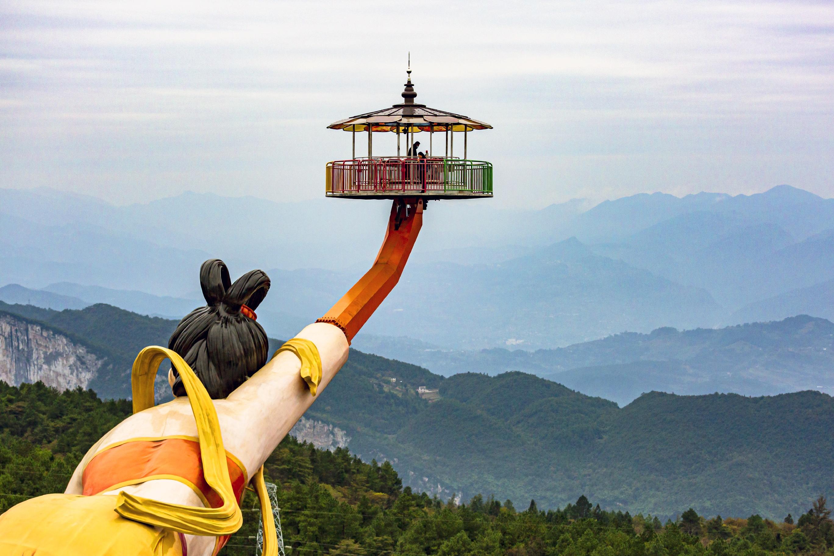 重庆“飞天之吻“就建在千米悬崖的边上,造型是一男一女两尊高55米的建筑,男的蓝色裤子,女的红色裙子,手上都举着一个“笼子”。这笼子就是观光塔,每个笼子可以上30个人。机器启动之前,两尊巨人都是俯卧在地上的,以便游客登上“笼子”。等游客上去之后,机器开始启动,巨人开始缓缓抬升、旋转,然后交错,看起来就跟吻上了一样。