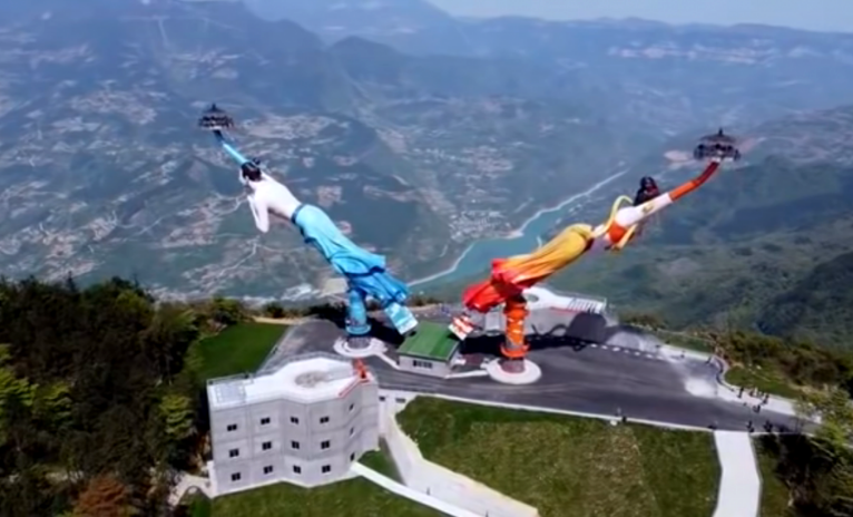 这一设计是建立在海拔1250米的高的悬崖边上,两座高52米,总重为620吨,“王子”和“仙女”手上,各有一个最多可承载60人的“飞行岛”,双刀在高空定格后,旋转307度间会形成飞天之吻的景象。