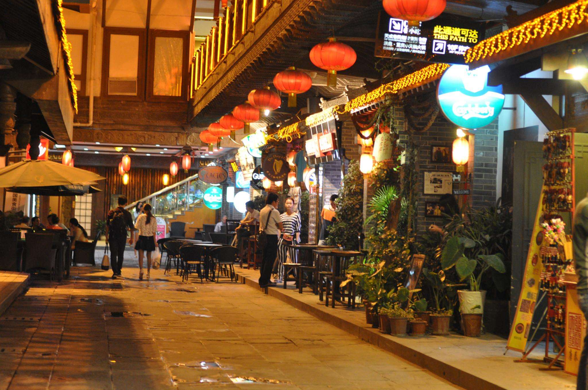 异域风情街,洪崖洞整体景观里的一小部分,位于第9-10层(对于很多人来说就是平台下面的1-2层),有各国美食餐厅,还有临江景的咖啡厅,紧紧靠江边,可以品美食,看江景。
