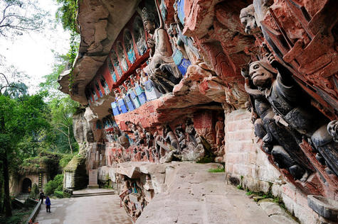 宝顶山,风景幽丽,共13处石刻,以大佛湾和小佛湾规模最大。大佛湾为幽深的马蹄形山湾,雕刻分布在东、南、北三面,先以小佛湾为蓝图,后在此雕造。由19组佛经故事组成的大型群雕,各种雕像达15O00多躯,设计之精巧,竟无一雷同,破了“千佛一面”之说。宝顶圆觉洞,为整石开凿,宽敞如室。洞正壁刻佛像三尊,主佛前有跪菩萨一尊,俯首合十,恭敬虔诚,左右壁为十二圆觉菩萨,跌坐莲台,妙丽庄严,姿态不一,衣服、肌肉质感真实,似薄纱突身,衣裙流畅自如。壁间刻楼台亭阁,人物鸟兽,花草树木,幽泉怪石,近似写实作品,是大佛湾雕刻的精华。