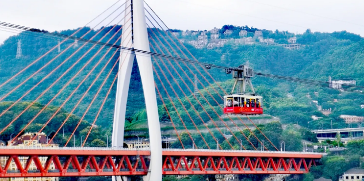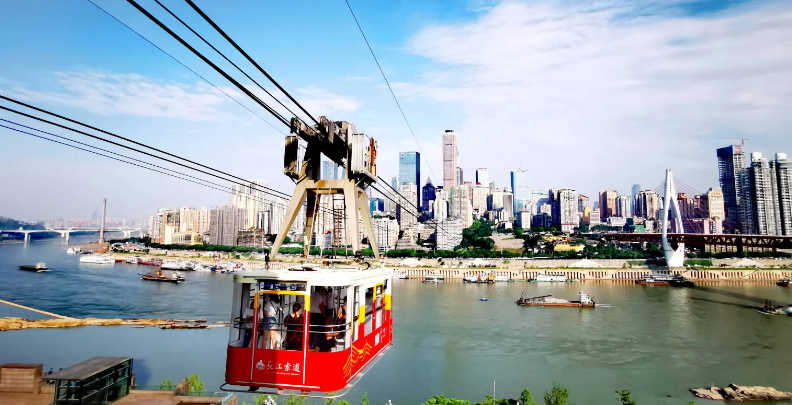 长江索道,已经成为了游客在山城的必游项目。索道起于渝中区长安寺(新华路),横跨长江至南岸区的上新街(龙门浩)。乘上索道,滑向江对岸,一路可见近在咫尺的钢筋森林、长江以及江北南岸区的风光。