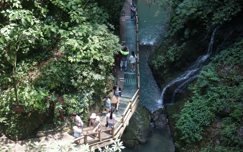 :绵延几十平方公里的森林,遮天蔽日,古朴幽深,古树参天,竹林密集,植被优良。树种繁多,枝叶茂盛,四季常绿;林中常有蝉鸣、鸟唱,泉水叮咚,更添山林之幽静。