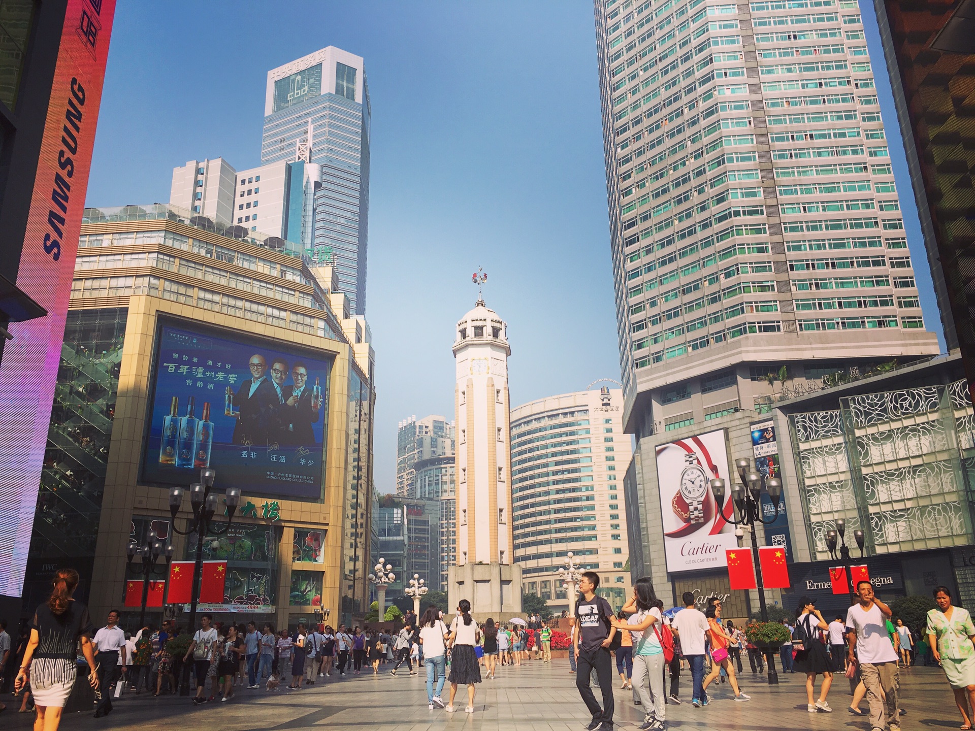朝天门广场是重庆市区最大的观景平台,长江和嘉陵江交汇于此,站在广场上可观看两江三岸的风光。重庆是著名的山城,城市建筑错落有致,大山、大江、大城。