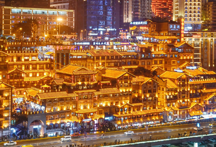 ,可乘坐电梯进入洪崖洞商业街。洪崖洞的民俗音乐广场、国泰剧院和解放碑森林广场可容纳三千多人,是重庆商业的发源地;洪崖洞11楼和1楼走出去都是马路的山城特色;洪崖洞的景点有:
