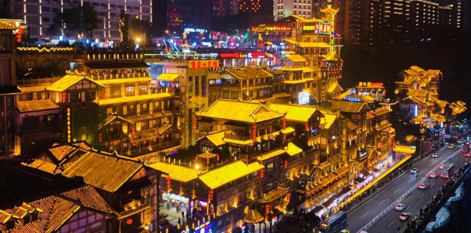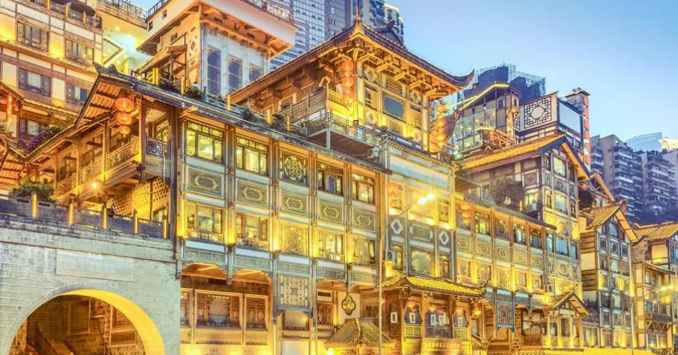 吊脚楼群,洪崖洞绝壁悬崖上的“吊脚楼群”,是独特的巴渝传统建筑。重庆洪崖洞民俗风貌区就是这一城市旅游景观的真实写照。因水而生、顺崖而长,高低错落、依山就势,让重庆解放碑步行街直达江滨,被誉为新重庆的“城市名片”。