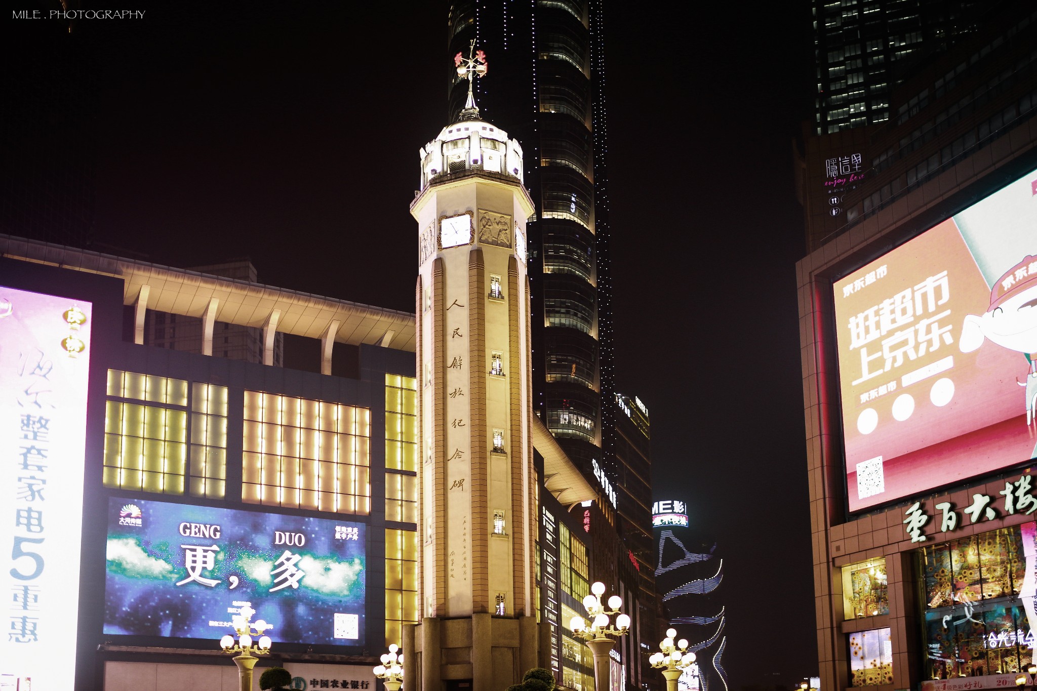 景区介绍:解放碑步行街,以解放碑的碑为中心的大十字,含民权路、民族路和邹容路共2. 24万平方米为核心,区域内商业网点达4482个,营业面积共121万平方米,其中,营业面积超过5000平方米的大型商场有20多家。
