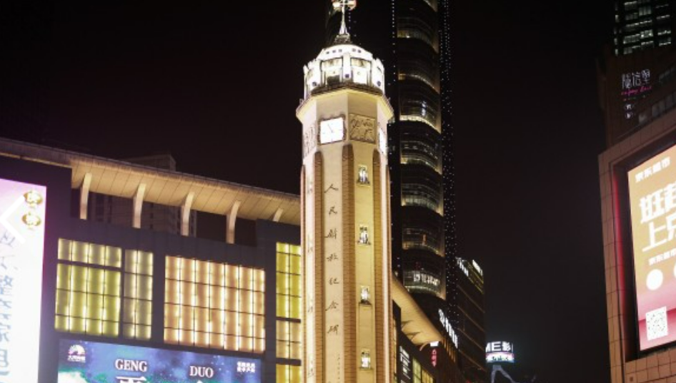 抗战胜利纪功碑暨人民解放纪念碑廊上原挂有抗战英雄、伟大战绩及日本投降等图照,重庆解放后,人民解放纪念碑改建,保存原碑体结构,浮雕图案改成人民解放军战士形象和装饰性图案。