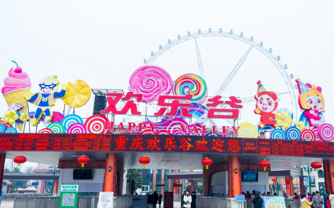 重庆欢乐谷,位于重庆市两江新区礼嘉镇金渝大道;分为欢乐时光、梦幻岛、飓风湾、恐龙森林、老重庆、河谷矿山小镇六大主题区。