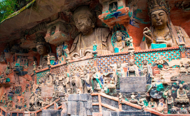 重庆大足石刻景区与敦煌莫高窟、云冈石窟、龙门石窟齐名,是大足县境内主要表现为摩崖造像的石窟艺术的总称。景区有74处5万余尊宗教石刻造像,是唐末、宋初时期的宗教摩崖石刻;以佛教题材为主,儒、道教造像并陈,尤以北山摩崖造像和宝顶山摩崖造像为著。