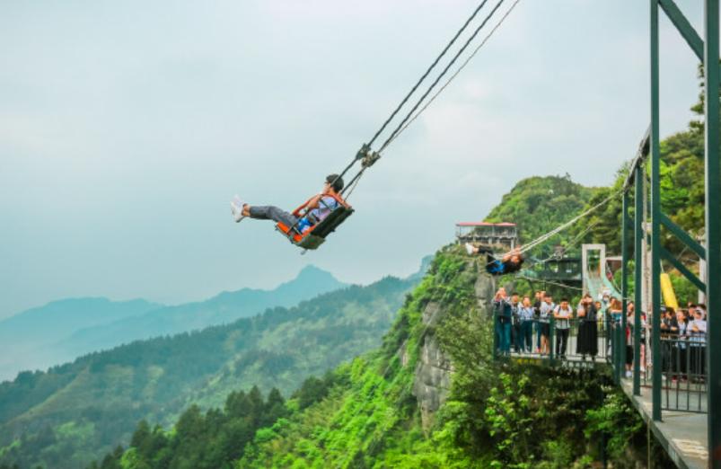 万盛奥陶纪有一条横跨150米的玻璃吊桥离地面300米,当你跨过去的时候不但挑战了自我,还能看到喀斯特美景。如果你听到了嘶吼的尖叫声,那一定是在悬崖秋千上传来的,有两种4米和8米的,在300米的高空拉回来又推出去真是惊险刺激,一念天堂一念地狱,有种人在前面飞魂在后面追的感觉。