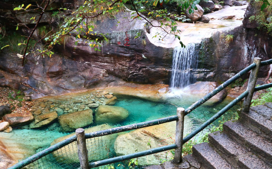 翡翠谷,昵称“情人谷”,位于黄山风景区南大门汤口镇山岔村,紧靠205国道和合铜黄高速公路。峡谷长达6华里,分布着一百多个形态各异、大小不同的彩池。彩池随周围景色变幻、太阳角度及光线明暗的不同,或晶明或翠绿,变化万千,绚丽多彩,宛如一颗颗翡翠洒满谷中,故名翡翠谷。 在获奥斯卡四项大奖的影片《卧虎藏龙》中,竹稍打斗、池边爱恋、飞瀑踏波等镜头都拍摄于翡翠谷。