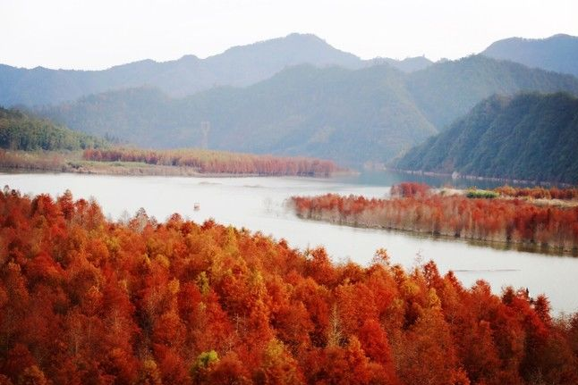 公园简介落羽杉湿地公园位于安徽宁国方塘乡青龙湾水库腹地,沿着浅浅的弯流,万亩水杉密集整齐地生在水中,与宽广碧绿的水面相互映衬,美不胜收。随着寒冬渐深,红杉林渐渐变红,浅红、深红、金黄,各种颜色相互交织着,倒映在清澈明净的水面,更是美的不可思议,恍如北疆的喀纳斯风光。远处巍峨的青山被绿水环绕,与身旁层层叠叠金红色的落雨杉遥相呼应,装点出一处独特的宛若油画般的湿地公园美景,也不愧于安徽“川藏线·最美宁国段”的这一称号。