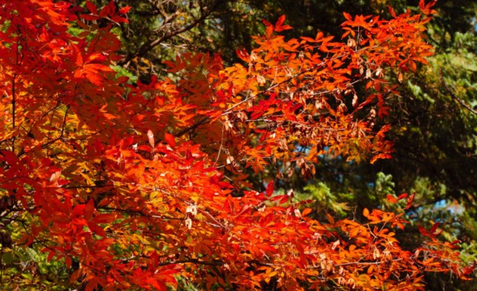 深秋的红叶漫山遍野,不同树种受海拔影响呈现不同颜色,红的艳、橙的金、黄的亮、绿的深沉,秋色像落入宣纸上的颜料,渲染出迷人的图画来,近看道旁,落叶缤纷铺满地,远望山坳,层林尽染叶如丹。