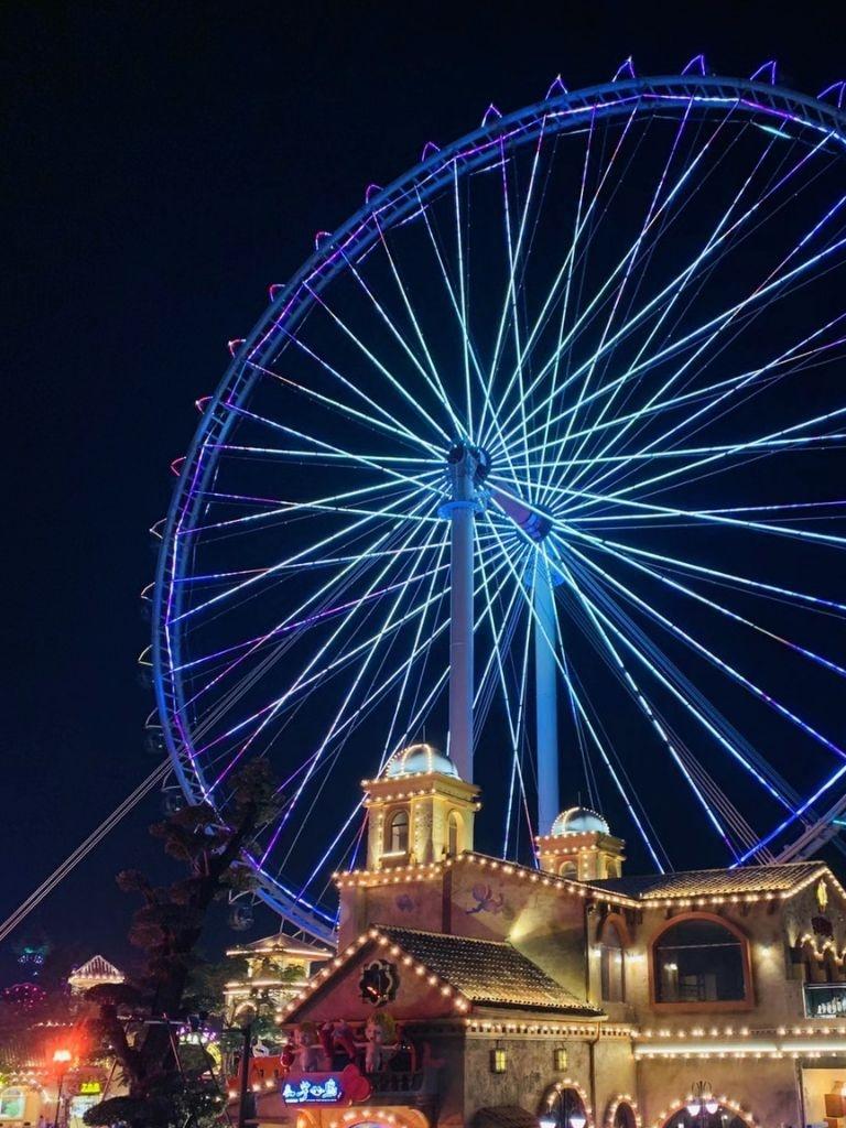 1.摩天轮是一种大型转轮状的机械建筑设施,上面挂在轮边缘的是供乘客乘搭的座舱,乘客坐在摩天轮慢慢的往上转,可以从高处俯瞰四周景色。最常见的摩天轮存在的场合是游乐园(或主题公园)与园游会。