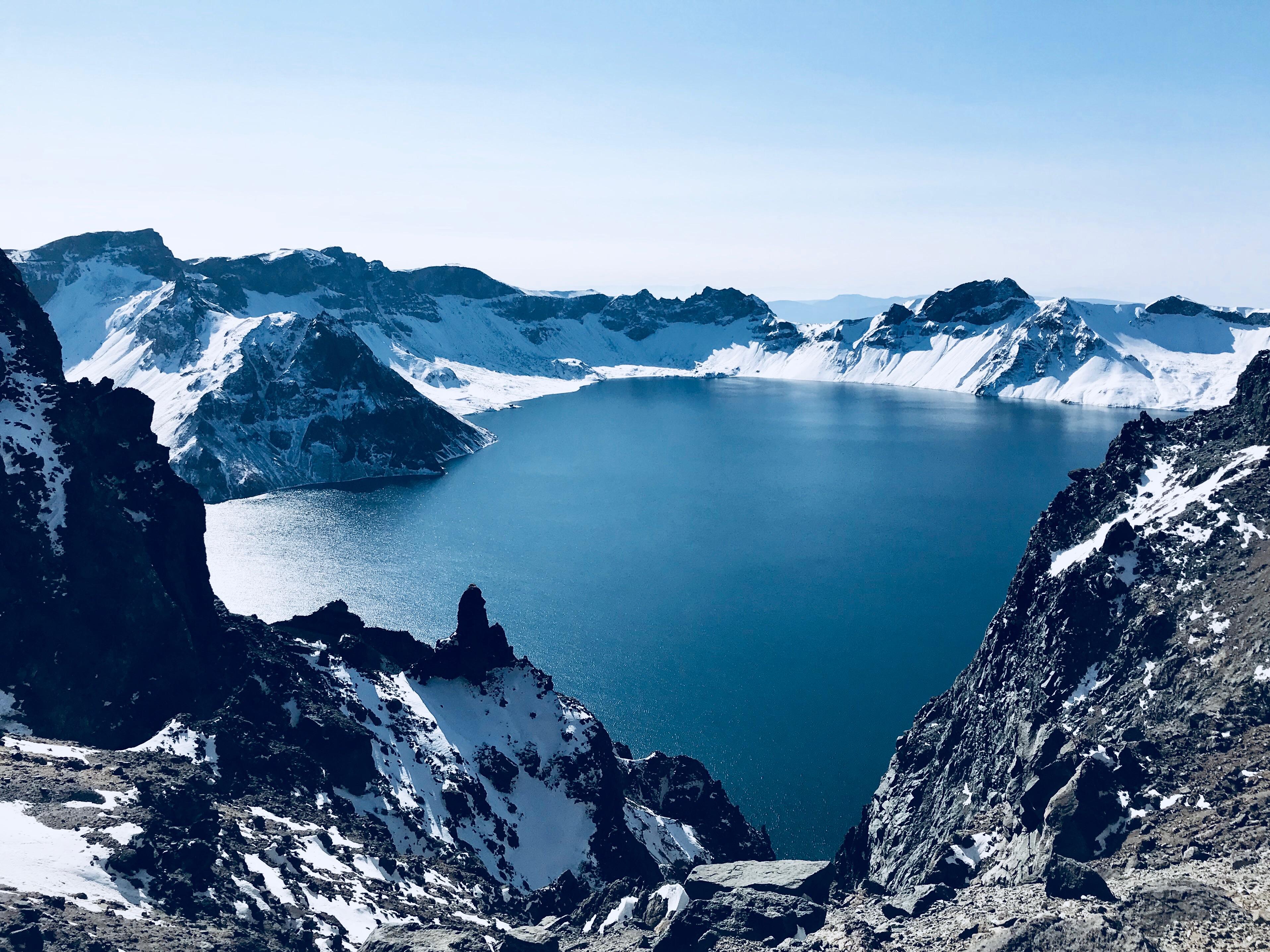 长白山天池是一座休眠火山,火山口积水成湖,夏融池水比天还要蓝;冬冻冰面雪一样的白,被16座山峰环绕,仅在天豁峰和龙门峰间有一狭道池水溢出,飞泻成长白瀑布,是松花江的正源。