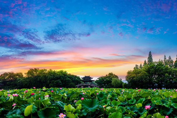 杭州西湖杭州西湖是我国有名的赏荷名地,南宋诗人杨万里有诗赞誉西湖荷花:“毕竟西湖六月中,风光不与四时同。接天莲叶无穷碧,映日荷花别样红。”每年7月初至9月初就是杭州荷花盛开的季节,荷花在七月初的时候会逐渐盛开,从7月中旬起到8月初,西湖130亩荷花区域将进入“不见水”的盛花期状态。这段时间来西湖赏荷花的人络绎不绝,每到七八月份,西湖就完全便成了荷花世界。