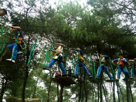 飞越丛林通过悬空桥梁、网道、步道、木桶、泰山秋千、飞狐索道和其他趣味环节进行树木间的探险,通过爬、滑、游、跨、跳、飞等动作越过所有障碍,到达终点。项目汇集了高空、速度、力量、毅力等户外探险所必备的元素,刺激、惊险、娱乐性极强。