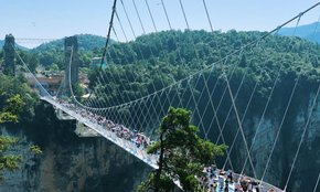 最著名的玻璃栈桥自然是张家界国家森林公园。位于张家界大峡谷景区,是世界最高、跨度最长的玻璃桥,大桥建在大峡谷两侧的峰顶上,横跨大峡谷。桥拱距谷底相对高度约400米,全长约370米,桥面全部采用透明玻璃铺设,桥中心有全球最高的蹦极。