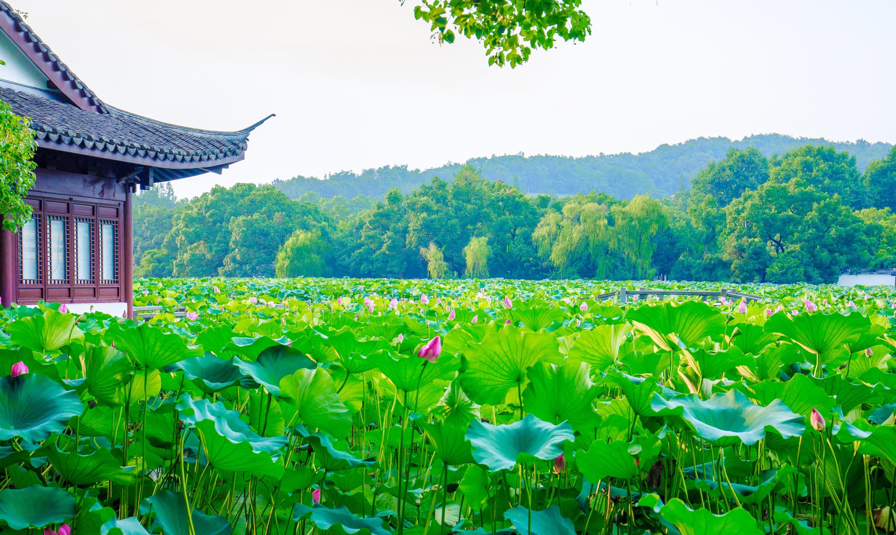 曲院风荷:占地14公顷,有曲院、风荷、滨湖密林等景区,东接岳湖,南邻郭庄,北接竹素园、植物园、岳飞墓庙,既是观赏“接天莲叶无穷碧,映日荷花别样红”的夏游名园,也是西湖北线热点游览区休闲娱乐的好去处。曲院最为精采处在风荷景区,宁静的湖面上,分布着红莲、白莲、重台莲、洒金莲、并蒂莲等等名种荷花。