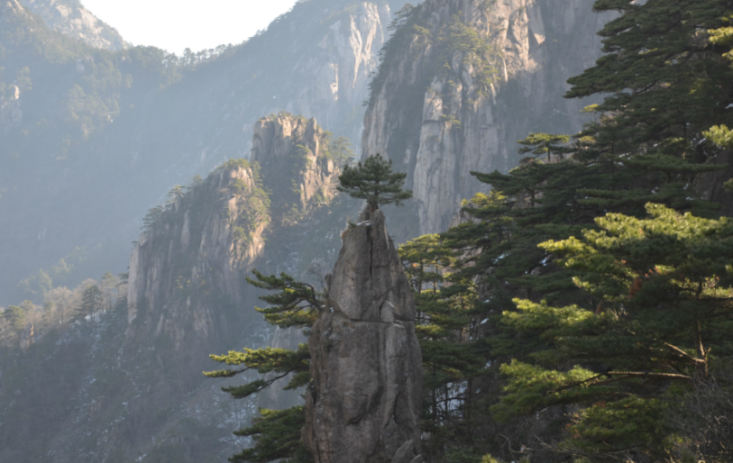 三、童子拜观音在耕云峰侧。立天都进脚,可见“天梯”旁有一石人亭亭玉立,头戴风帽,衣巾飘曳,酷似古装仕女。她的对面又有一石,酷似跪地下拜的童子。两块巧石,构成一幅神话图景——童子拜观音。今人有诗云:“善村童子惯虚心,五十三参道已深。为了洞明微妙法,黄山又拜古观音。”
