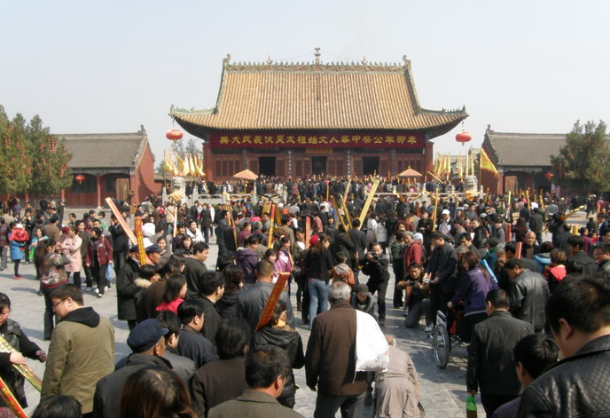 朝祖进香是庙会的基本内容。相传农历二月十五日是人祖伏羲的生日。伏羲与女娲一起,土造人创立八卦,制定嫁娶,奠定了中国早期文明。由善男信女组成的朝祖进香会,高举黄绫青龙旗,手捧香楼,肩挑花篮,在器乐声中,十分庄重地向人祖焚香跪拜,表达对祖先的崇敬。大凡祭祖朝香者,都要从家乡带来一把泥土,进香之后,添洒在伏羲陵墓上,寓意子孙繁荣昌盛。