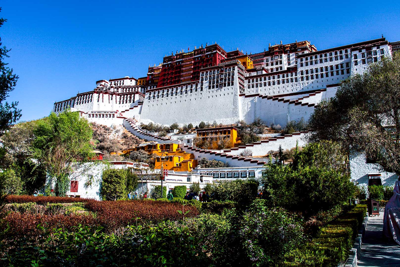 西藏布达拉宫布达拉宫位于中国西藏自治区首府拉萨市区西北的玛布日山上,是一座宫堡式建筑群,最初是吐蕃王朝赞普松赞干布为迎娶文成公主而兴建。整座宫殿具有藏式风格,高200余米,外观13层,实际只有9层。由于它起建于山腰,大面积的石壁又屹立如削壁,使建筑仿佛与山岗融为一体,气势雄伟。