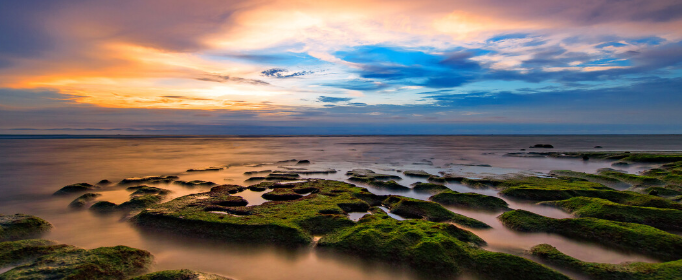 五彩滩五彩滩,位于涠洲岛东部,因退潮后,海蚀平台在阳光照射下呈现出五彩斑斓的颜色而得名,是岛上观赏海上日出的绝佳地点之一,退潮时,大片的海蚀平台裸露出来,经过海水打磨,犹如一幅幅印象派艺术画卷。