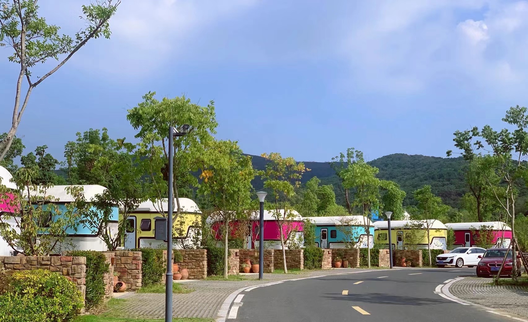 房车体验区由两种不同类型的拖挂房车组成,自成一排,在青山碧水间近距离接触大自然,品味田园风光,愉悦身心;夜晚您可以透过房车的车窗向外仰望漫天星空,呼吸着大自然的清新空气,温馨、舒适融为一体,愉悦和自然完美结合,为您的身心提供一个宁静放松的港湾。