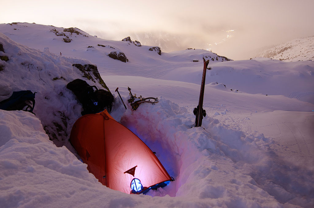 最后还可以注意的是,最好清除地面上的积雪,如果你的帐篷直接放在地上,而不是放在雪上,这样会保持更多的热量。并且小帐篷更容易保暖,所以冬季帐篷越小越好。