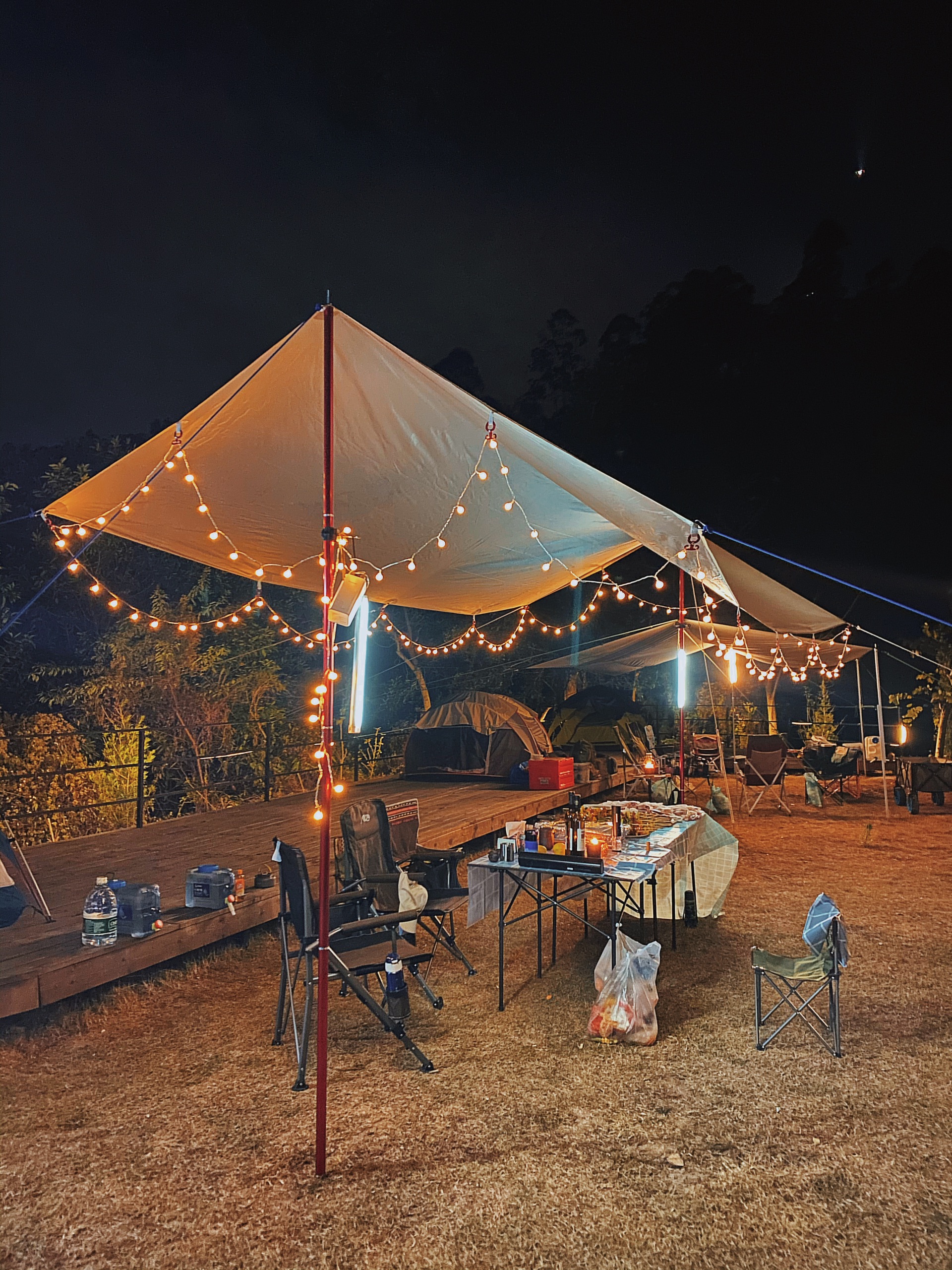 大尖山公园日夜景色:日景,这里靠近山水,而且草坪够大,靠近WC,沐浴室那边的露营区可以看到日出。而靠近马场那边的露营区就可以看到日落,确实挺美。夜景,主要还是靠自己搭出来的帐篷,之后挂一些星星灯,整个氛围会更不一样,而且超级出片。