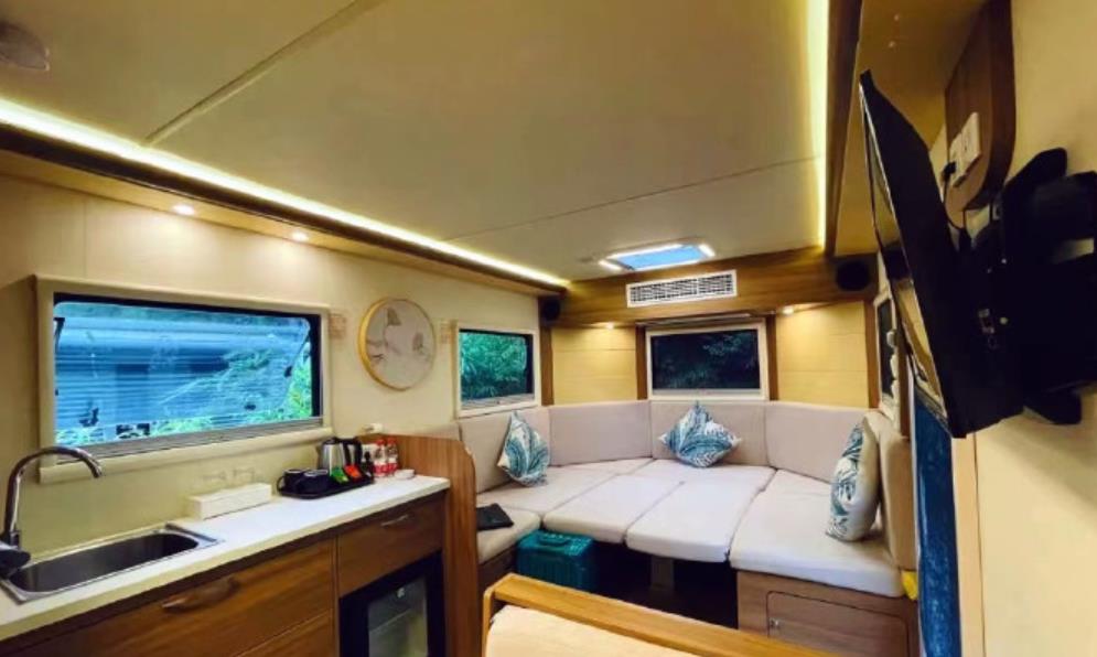 其实,房车里的洗澡间还是比较小的,但好在设计方面很合理,一个人洗澡也不会觉得拥挤,你可以站着洗,也可以坐着洗,而且这个空间里还有通风和空调的设备,不用担心空气不流通很憋闷。