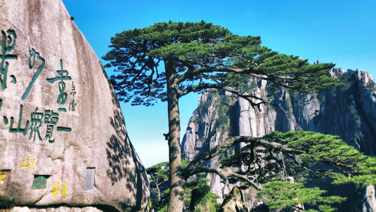 迎客松是黄山的标志性景观,也是安徽省的象征之一。在黄山玉屏楼左侧、文殊洞之上,倚青狮石破石而生,高10米;树龄至少已有800年,是黄山“四绝”之一。
