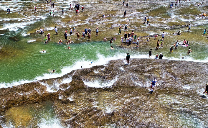 白水洋是鸳鸯溪五大景区中最具特色的天然景观,平坦的岩石河床一石而就,净无沙烁;登高俯瞰,其形状犹如一丘刚刚耙平的巨大农田;平展展地座落在崇山峻岭之中,因而当地人称“仙耙溪”。