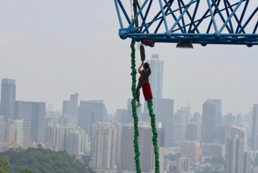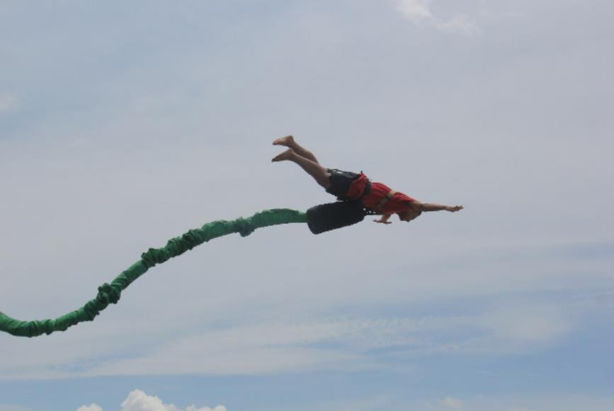 这是绑脚式蹦极,在高空45米落下、弹起,享受自由落体的快感与刺激。