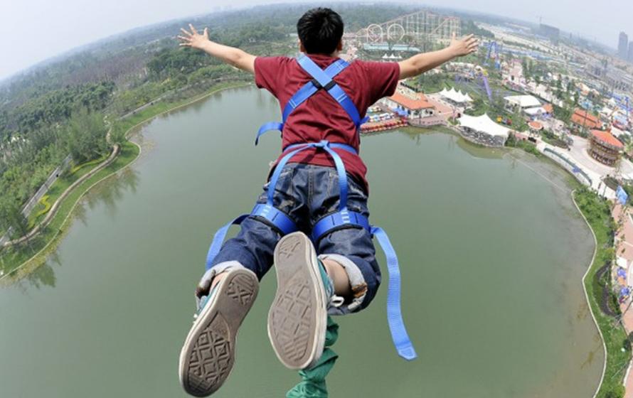 4、初次蹦极应该由绑背或绑背开始,也可挑战更刺激的绑脚式。绑背式也叫死亡体验式,但要量力而行。进入跳台一定要听从教练指挥,切忌自以为是。
