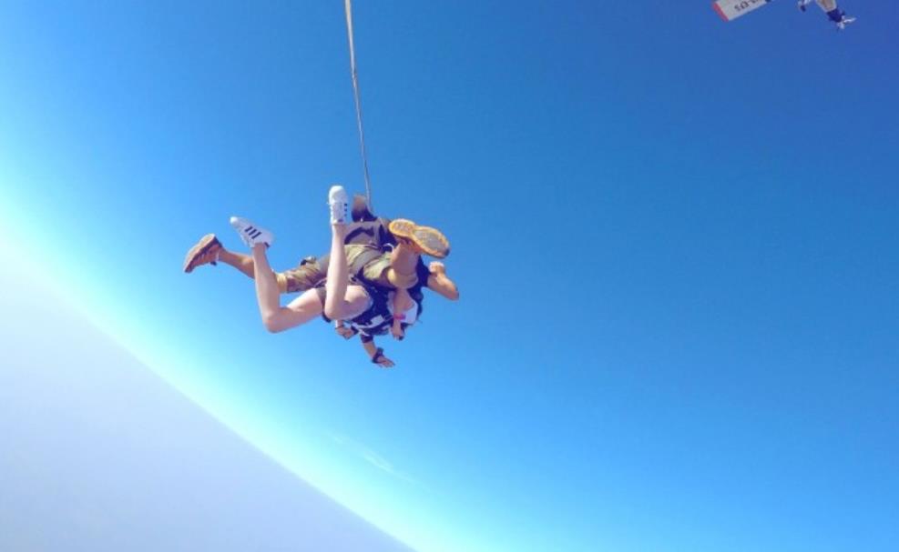 跳伞时,穿着尽量舒适、简练、合身,不穿易飞散或者容易兜风的衣服——以防走光,搭配运动鞋,不穿高跟鞋或靴子。要注意做好防晒工作。